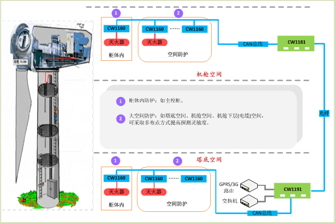 系統(tǒng)依照“以防為主,以消為輔”的設計,使用高靈敏度的火情數(shù)據(jù)傳感器,探測風力發(fā)電機機艙控制柜、齒輪箱高速軸制動器、發(fā)電機定子接線盒外、發(fā)電機轉子滑環(huán)室外、電氣盤柜(變流器、主控系統(tǒng)等)、機艙等主要風機內各空間起火臨界點之前所產(chǎn)生的微量煙霧、CO濃度、火焰狀態(tài)等信息,并監(jiān)測實時溫度,采用多傳感器冗合智能判斷機制,實時可靠判斷危險點狀態(tài)及燃燒階段,通過專業(yè)火災報警控制器實現(xiàn)數(shù)據(jù)通訊、本地控制,通過主站軟件實現(xiàn)遠程數(shù)據(jù)監(jiān)測和控制;在發(fā)現(xiàn)火災數(shù)據(jù)報警緊急情況時,系統(tǒng)根據(jù)預置邏輯,實施自動控制和聯(lián)動控制,進行預警和消防。